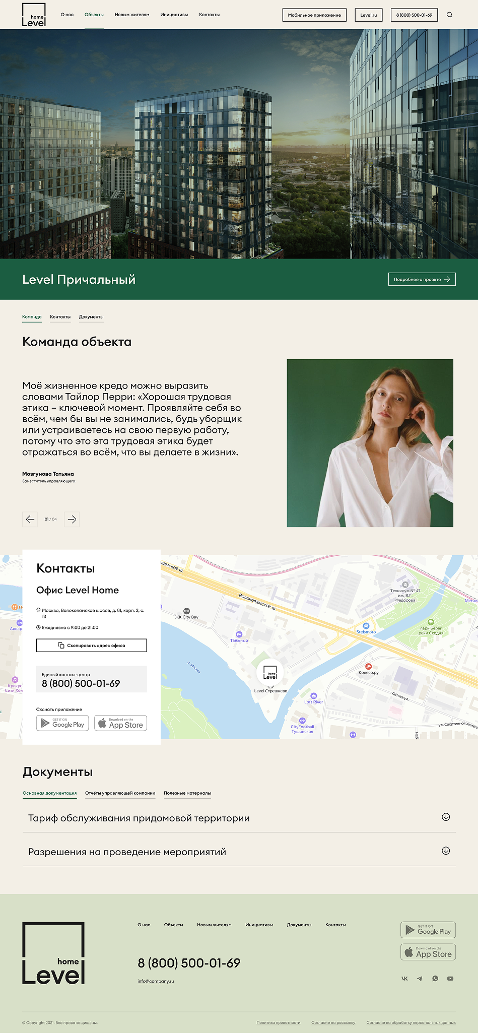Содержит информацию, ориентированную в первую очередь на действующих клиентов - жильцов домов, находящихся под управлением компании. В каждой карточке объекта на одной странице демонстрируется вся самая важная и необходимая информация: описание дома, контакты офиса, команда и документация объекта.